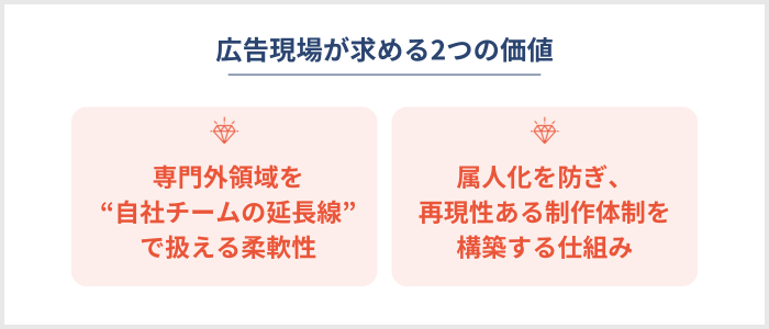 営業やプロデューサーが現場に張り付き、個人の力量に依存する体制が続く中で、安定的に複数案件を進行させるには「もうひとつの社内チーム」が必要とされています。